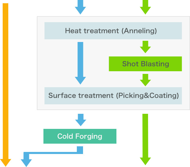 We are working on manufacturing CHQ steel wire that meet customer’s requirement (Size , Shape , Hardness , Surface quality) and characteristics of product which customer produces under optimum processes, Drawing , Rolling , Surface treatment(Pickling&Coating), Heart treatment(Annealing). In addition we manufacture Near Net Shape Cold forging parts and Cold forging slugs in house-made CHQ wire, by aking use of the holding equipments effectively.
