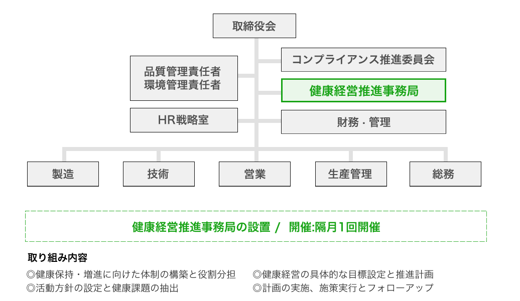まずは、戦略的、計画的に実践することで、取り組みをより一層充実したものとするために、総務部で抱えていた健康経営に関わる業務を切り出し、責任と権限を付与し、プロジェクト型で取り組んでいくこととし、裁量をもって取り組んでいます。